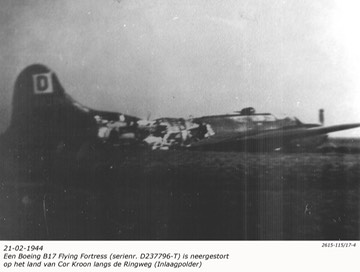 Een Boeing B17 Flying Fortress (serienr. D237796-T) is neergestort op het land van Cor Kroon langs de Ringweg (inlaagpolder) dd 21-02-1944 http://www.100thbg.org/mainpages/crews/crews5/fletcher.htm This aircraft was assigned to the 100th Bomb Group - 350th Bomb Squadron and crash-landed after losing three engines. The aircraft came down near Spaarndam, (Five miles north east of Amsterdam) The Netherlands at 1449 on 21 February 1944 while returning from a bombing mission against Brunswick GR. The pilot was Lt. William Fletcher who, at the request of the crew, crash-landed the aircraft rather than having the crew bail out! None of the airmen were injured. The ten crewmen were taken prisoner and were held in various Stalag Luft camps until released by the Allies.
