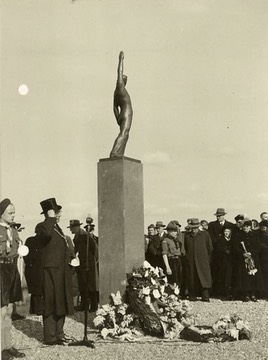 Tekst bij de foto’s van het tweede monument: Moment van overname van gedenkteken door Dhr. L.H. Simons burgemeester van Haarlemmerliede en Spaarnwoude. NB. Beeldhouwer en ontwerper Dhr. J.W. Havermans Oude Pastorie Sloterdijk Amsterdam (W.). De steen: Ettinger tufsteen uit de Eifel Duitsland, geleverd door de firma L.M.v.Tetterode Duivendrechtsekade 13 Amsterdam. Het Beeld: vervaardigd door Bronsgieterij firma A.N.Binder Duinlustweg 28 Overveen.